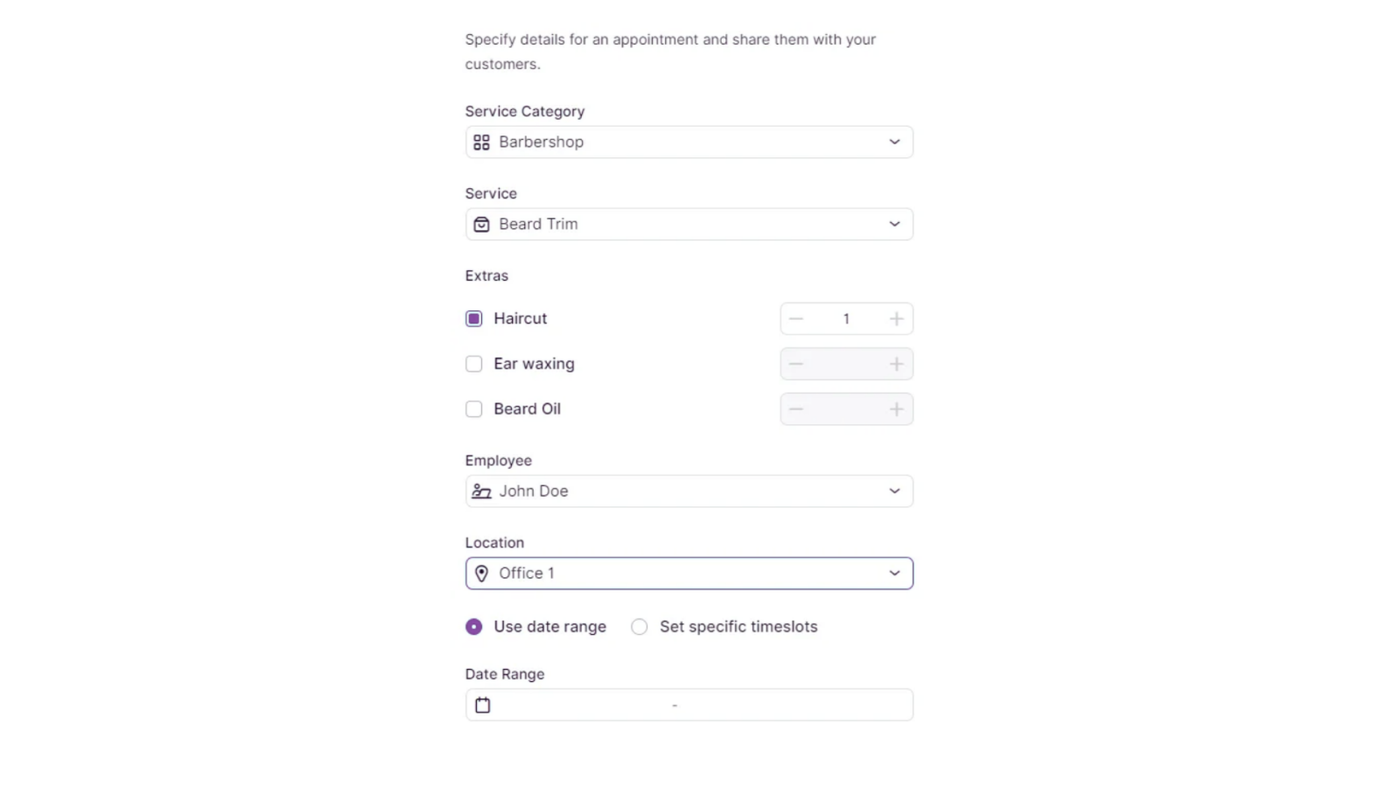The Use Date Range option allows you to select a single date (by double-clicking the date) or a range of dates when you will offer appointments, while the Set specific timeslots option allows you to select multiple time slots (you can select a single date with multiple time slots, or you can select multiple dates with different time slots).