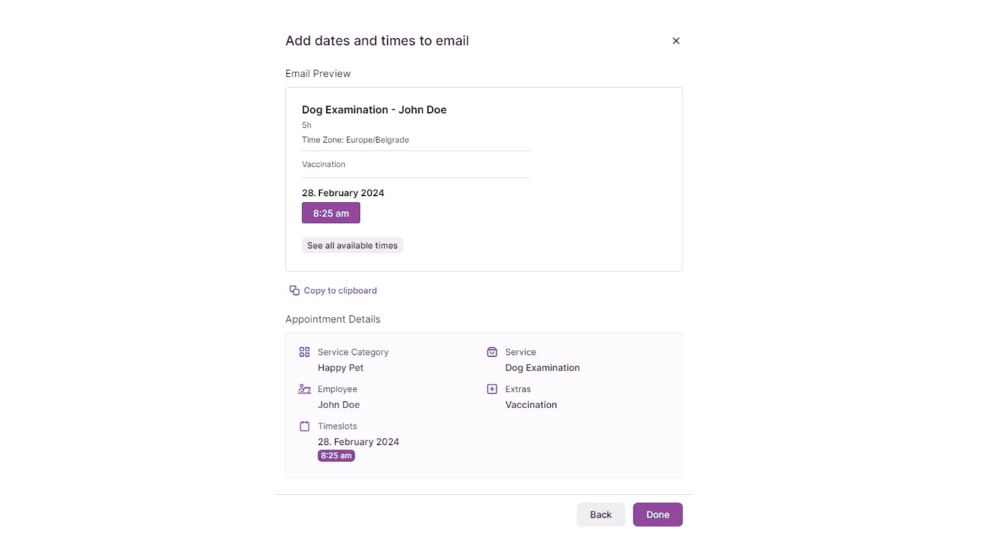 If you choose the Email option, once you configure the booking parameters, you will see an email draft that you can copy using the “Copy to clipboard” option.