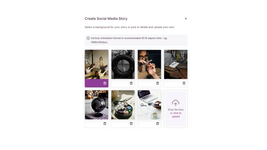 After defining the filters for what you’re about to share, you will see 7 predefined images that you will be able to select for your Social Media Story. The 8th option allows you to upload your own story image.
