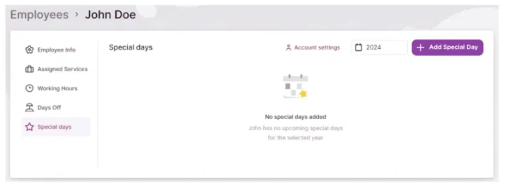 Employees can have custom special day schedules in addition to their regular working hours. This allows for flexibility in managing their availability based on specific dates or date ranges.