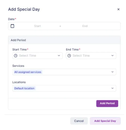 After accessing the “Special Days” tab, proceed by clicking on the “+ Add Special Day” button located in the upper right corner. This action will prompt a pop-up window to appear, as illustrated in the image below: