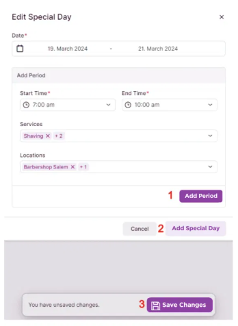 - If you’re creating a single period, after adding it, click “Add Special Day” (2) and then select “Save Changes” (3) which appears at the bottom of the page.