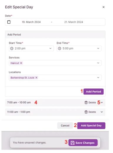 - If you’re creating multiple periods, each added period will be displayed at the bottom of the Special Day popup (4), allowing you to add consecutive periods to the same Special Day (you can always click on the down-arrow next to each added period to expand it and edit it (5)). Continue defining and adding periods as needed. Once all periods are defined, click “Add Special Day” (2) and then select “Save Changes” (3) at the bottom of the page.